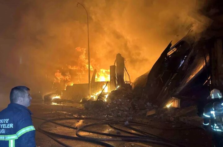 Uşak'ta Fevzi Çakmak Mahallesi'nde bulunan bir dokuma deposu ve fabrikada çıkan yangına itfaiye takımları...
