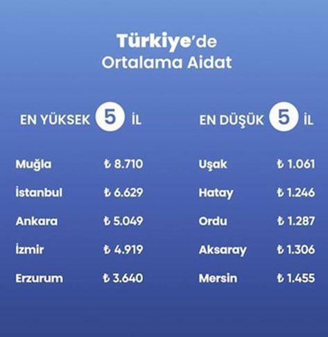 Rapor, Türkiye genelinde aidatların son yıllarda kayda paha ölçüde arttığını ve kimi vilayetlerde bu artışın enflasyonun dahi üzerine çıktığını ortaya koydu. Bilgilere nazaran 2025 yılında en yüksek aidat ortalaması, 8 bin 710 TL ile Muğla’da görüldü. Muğla’yı sırasıyla 6 bin 629 TL ile İstanbul, 5 bin 49 TL ile Ankara ve 4 bin 919 TL ile İzmir izledi.